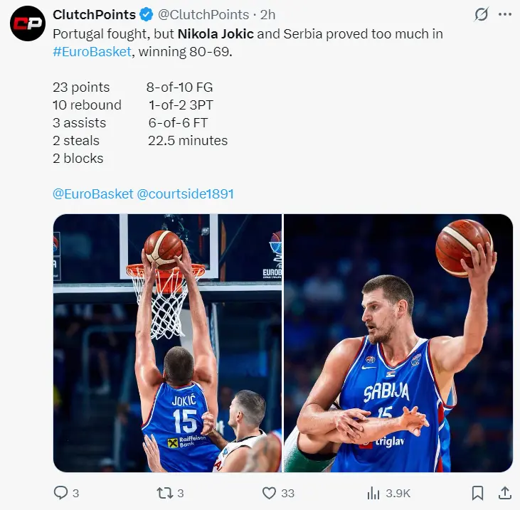 塞尔维亚男篮是本次欧洲杯的夺冠第一热门,不过这场小组赛他们的核心之一博格丹诺维奇受伤了,博格丹诺维奇目前在NBA是效力洛杉矶快船队,他是这支塞尔维亚的外线核心,他受伤后约基奇的组织压力、进攻压力都会大一些,这也是此役约基奇得分数据比首秀高的关键因素。